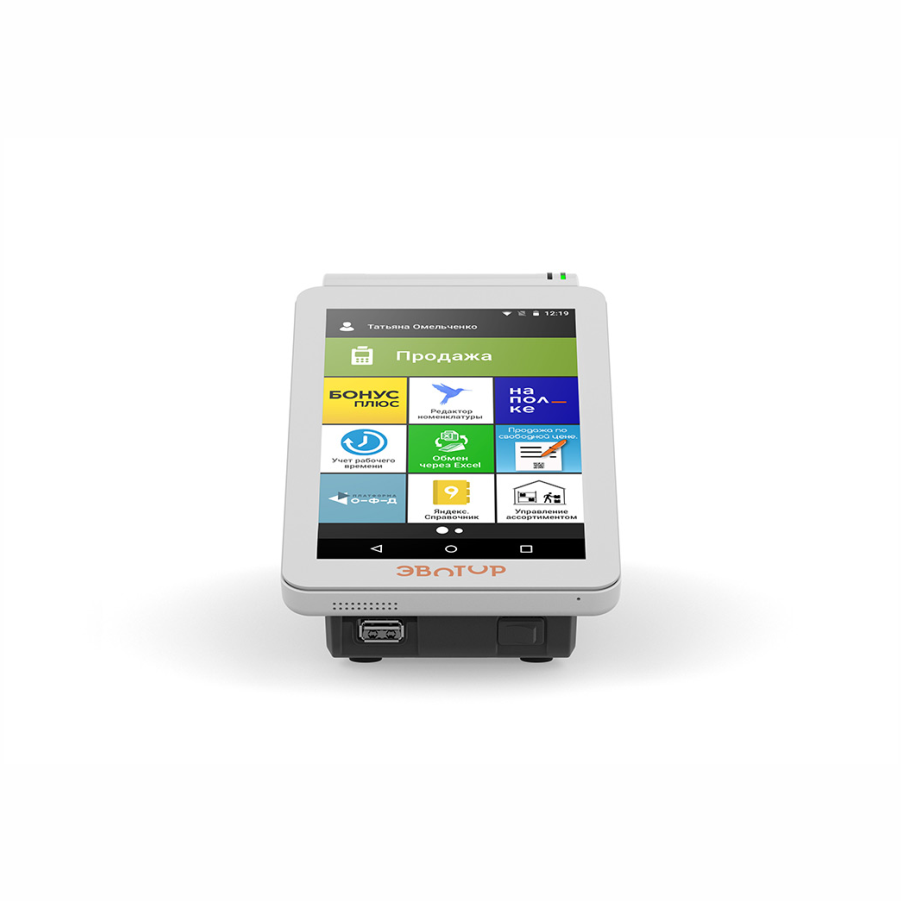 «Эвотор» — это компактная онлайн-касса с неограниченными возможностями. Всё в одном маленьком корпусе: компьютер, фискальный накопитель, принтер чеков. Эвотор можно научить всему, что захотите — просто установите нужное приложение.